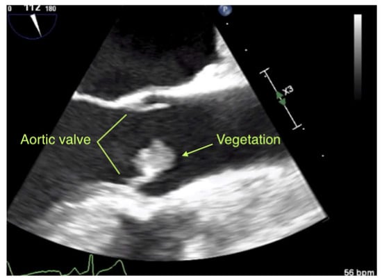 Supplementary materials can be found at https://www.mdpi.com/2075-4418/10/6/384/s1, Video S1: Ultrasound video. Transesophageal echocardiography performed in the long-axis view at midesophageal level. A visible echogenic mass, consistent with a vegetation of 12 × 12 × 10 mm3 adheres to the native aortic valve. Video S2: Coronary angiogram of the left coronary artery. A diagnostic coronary angiogram depicts a lesion in the apical section of the left anterior descending artery (LAD) and no visible sclerosis. No stenting was performed.