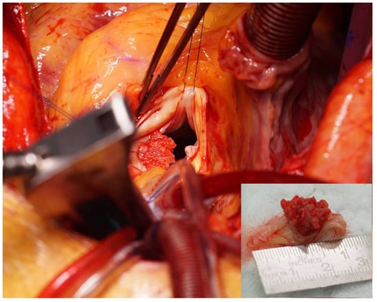 Intraoperative view. Intraoperative view showing a large vegetation on the aortic valve and close-up of the excised leaflet (inset). Two leaflets fused to form a functionally bicuspid valve.