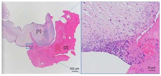Histological examination. Histological examination of the excised aortic valve (hematoxylin and eosin stain) shows a florid inflammation consisting mainly of neutrophilic leucocytes. [1] Leaflet and [2] attached fibrinous material.