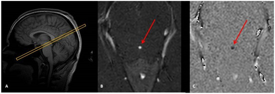 Sagittal image scout (A) to localize the aqueduct and to prescribe a perpendicular 2D Cine-phase MRI slice. This provides a magnitude image (B) suited to visualize and select the aqueduct (red arrow) and a phase-difference image to map the CSF flow (C). (B) and (C) represent one phase of the cardiac cycle.