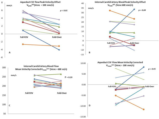These comparative plots represent the measures for each volunteer. The graphs demonstrate the differences between Full-FOV and fold-over when we measured the peak velocity offset in the aqueductal CSF (A) and the internal carotid artery blood (B). We also show the difference in flow mean velocity following phase-offset correction in the aqueduct CSF (C) and internal carotid arterial blood (D).