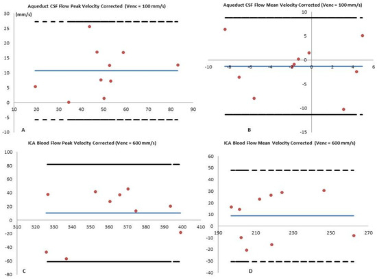 Bland–Altman analysis [11] showed a small systemic difference between Full-FOV and fold-over when measuring Vmeancorr and Vpeakcorr (Figure 4). In the ICA blood flow, the bias was under 1% for all variables except for the net flow QNet (2.11%, 2.05 μL.s−1) and the net flow corrected QNetCorr (3.78% 4.83 μL.s−1). In the aqueduct CSF flow, the bias fluctuation was more pronounced (Table 4) and it reached 71% in the Vmin (11.03 mm.s−1) and 3.99% in VminCorr (−0.59 mm.s−1). We measured a −13.35% bias in the VmeanOff (0.17 mm.s−1) and a 6.68% in the Vmean (2.27 mm.s−1). The peak velocity biases were as follows: VpeakOff (1.83 %, 0.05 mm.s−1), Vpeak (4.3%, 0.63 mm.s−1), and VpeakCorr (2.42%, 0.26 mm.s−1).