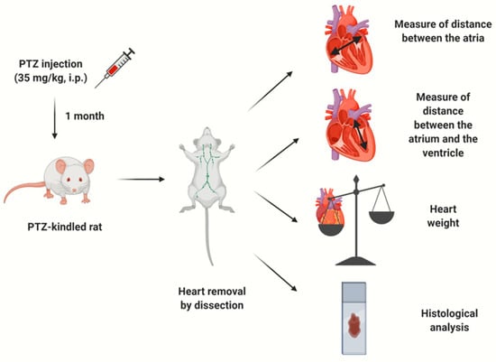 A summary of the experimental study: pentylenetetrazol (PTZ) injection, heart dissection, targeted measures and histological analysis, respectively.