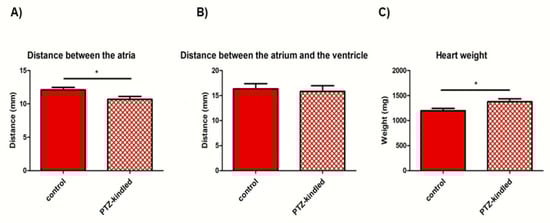 Measures of distance between the atria (A), between the atrium and the ventricle (B), and heart weight (C) in PTZ-kindled rats vs. controls. Data represent the mean ± SEM of the distance expressed as mm and the heart weight expressed as mg, n = 14 for each group, * p < 0.05.