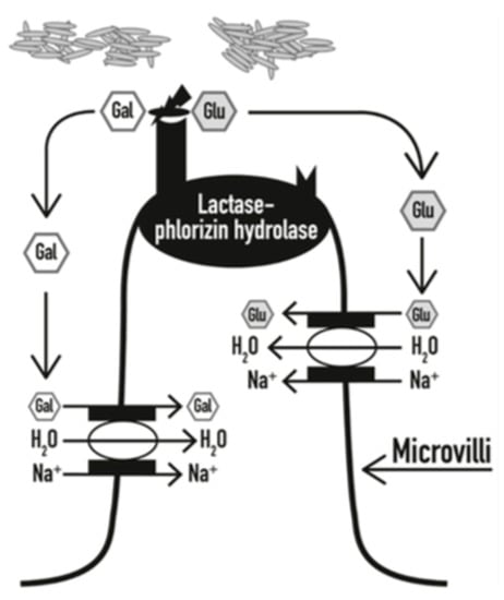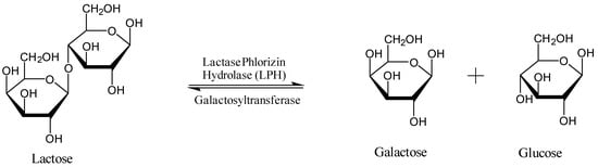Lactose, the main source of sugar from mammalian milk products, is a disaccharide consisting of d-glucose and d-galactose held together by a β-1,4 glycosidic bond (Figure 1) [,]. Synthesis of lactose in the mammary gland occurs via an activated uridine di-phosphate galactose being coupled with glucose by galactosyl transferase []. In order for lactose to be digested, lactase phlorizin hydrolase (LPH) breaks down the disaccharide into glucose and galactose, which are then carried via the sodium glucose transporters across the intestinal brush border []. LPH is found on the upper surface of enterocytes on the microvilli of the small intestine and is largely expressed in the central jejunum. Once lactose is hydrolyzed, the monosaccharides are individually utilized by the body; glucose as a source of energy, galactose as part of glycoproteins and glycolipids [,,].
