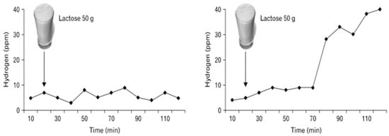 Example results from lactose malabsorption and intolerance—hydrogen breath test (HBT) with a 50 g oral lactose load. Left depicts a negative result; right depicts a positive result (as taken from []).