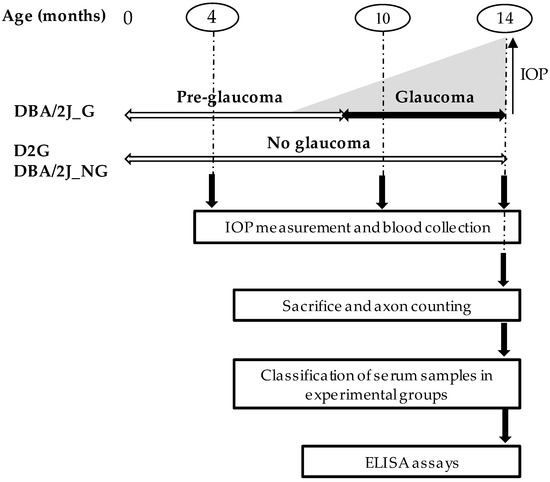 The experimental design is shown in Figure 1. The IOP was measured and blood was drawn from all mice (D2G and DBA/2J) at 4, 10, and 14 months of age. After 14 months, the mice were sacrificed by cervical dislocation and the optic nerves were processed for the subsequent axonal damage assessment. The serum samples were classified into several experimental groups based on the estimated pathological state of the mouse at the time of blood sampling. Glaucomatous state was inferred according to the optic nerve damage at the time of the sacrifice. The DBA/2J mice that did not develop glaucoma (DBA/2J_NG) were used as controls to evaluate any possible existing age-related changes in the levels of the studied molecular markers. However, considering that the expected number of DBA/2J_NG mice would be 30% maximum, and in view of the number and amount of these control samples not being sufficient for the analysis of all the proposed proteins, the D2G strain was included as an additional control group to verify existing age-related differences in the remainder studied proteins.