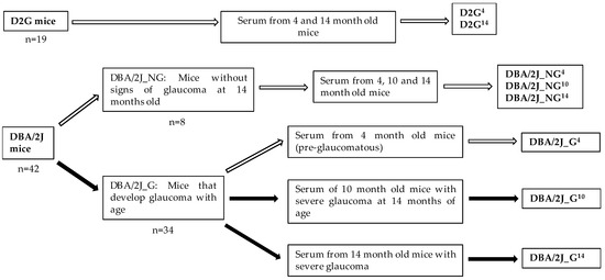 Experimental groups. Control groups: D2G4, D2G14, DBA/2J_NG4, DBA/2J_NG10, and DBA/2J_NG14. Glaucoma groups: DBA/2J_G4, DBA/2J_G10, DBA/2J_G14. White arrows indicate samples of non-glaucomatous mice. Black arrows indicate samples of glaucomatous mice.