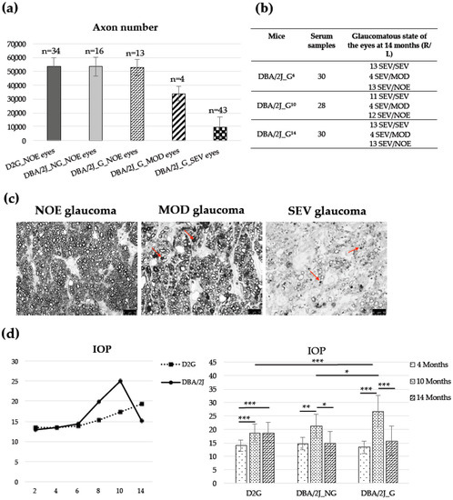 Figure 3 (panel a) summarizes the average of axons of the eyes of 38 DBA/2J (24 females and 14 males) and 17 D2G (13 females and 4 males) mice of 14 months of age. As expected, none of the D2G mice showed any signs of glaucoma in their optic nerves. Among the DBA/2J strain, 8 mice (6 females and 2 males) did not develop glaucoma (i.e., 21%, DBA/2J_NG), while the rest (30 mice, 18 females, and 12 males) developed glaucoma (DBA/2J_G), all of them severe in at least one eye at 14 months old (13 SEV/SEV, 4 SEV/MOD and 13 SEV/NOE). The average axons of optic nerves classified as NOE were 53,449 ± 6335 (34 eyes), 53,412 ± 6985 (16 eyes), and 52,614 ± 5840 (13 eyes) for D2G, DBA/2J_NG, and DBA/2J_G, respectively, without significant differences between groups (p-value > 0.05). The average axons of optic nerves of DBA/2J_G with MOD glaucoma was 33,816 ± 5361 (4 eyes) and for optic nerves with SEV glaucoma was 9456 ± 7813 (43 eyes), with significant differences between SEV and MOD optic nerves, p-value < 0.01. Similarly, significant differences were found when comparing SEV or MOD optic nerves of DBA/2J_G with NOE optic nerves of D2G or DBA/2J mice, p-values < 0.001.