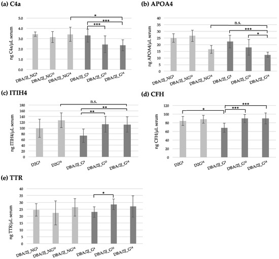 (a) Concentration of protein C4a (ng of protein per μL of serum) in DBA/2J_NG4,10,14 and DBA/2J_G4,10,14 groups. (b) Concentration of protein APOA4 (ng of protein per μL of serum) in DBA/2J_NG4,10,14 and DBA/2J_G4,10,14 groups. (c) Concentration of protein ITIH4 (ng of protein per μL of serum) in D2G4,14 and DBA/2J_G4,10,14 groups. (d) Concentration of protein CFH (ng of protein per μL of serum) in D2G4,14 and DBA/2J_G4,10,14 groups (e) Concentration of protein TTR (ng of protein per μL of serum) in DBA/2J_NG4,10,14 and DBA/2J_G4,10,14 groups. The p-values were obtained by the Kruskal-Wallis test with Dunn’s Multiple Comparison test. n.s., not significant; *, p-value < 0.05; **, p-value < 0.01; ***, p-value < 0.001.