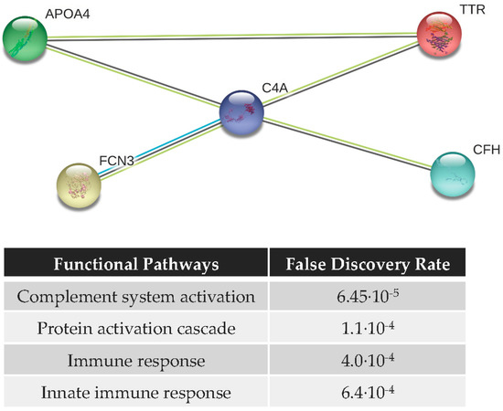 Figure 5 shows the PPI network of the most discriminant 5-proteins (C4a, CFH, FCN3, APOA4, and TTR) analyzed by ELISA in mice, consisting of 5 nodes and 5 edges with PPI enrichment p-value < 2.68 × 10−7, which means that they are partially biologically connected as a group. Functional analysis indicates that the biological processes in which these proteins participate are related to the immune system. The statistically enriched pathways (p-value < 0.05) include: (i) complement system activation (p-value = 6.45 × 10−5); (ii) protein activation cascade (p-value = 1.1 × 10−4); (iii) immune response (p-value = 4.0 × 10−4); and (iv) innate immune response (p-value = 6.4 × 10−4), among others.