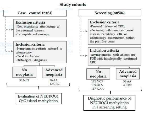 The study included two different cohorts: A case-control and a screening cohort. The case-control cohort was used to evaluate individual CpG sites in NEUROG1 promoter using bisulfite pyrosequencing and optimize the CpG sites with increased discriminatory capability, while the screening cohort was used to evaluate and validate the selected CpG sites through a nested methylation-specific qPCR. The study design is summarized in Figure 1, as well as the exclusion and inclusion criteria.