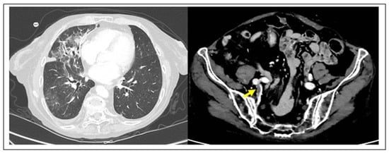 TC imaging of DVT complication in COVID-19 pneumonia. (Left) COVID-19 pneumonia with typical association of ground glass opacities and thickening of interlobular septa, particularly visible at the level of the right lung. (Right) The same case complicated by right hypogastric DVT (yellow arrow) (D-dimer 5.52 2.0 µg/mL).