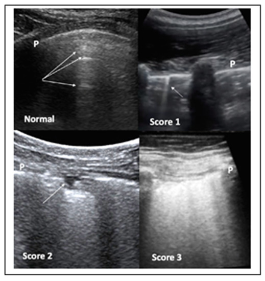 It has been also suggested that LUS should involve two operators in the acquisition protocol in order to reduce their exposure time to COVID-19 patients, with the first scanning and the second one storing the images. Both convex and linear probes can be used. Moreover, the standard LUS investigation is composed by 14 intercostal windows, seven for each side: three posteriorly along the paravertebral line; two laterally along the mid-axillary line; two anteriorly along the mid-clavicular line, these latter ones below and above the inter-nipple line, respectively. The LUS in patients not able to maintain a sitting position can be performed in lateral decubitus. COVID-19 pneumonia can be also scored for severity by LUS (Figure 3).