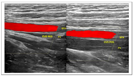 CUS maneuver for rapid identification of DVT. (Left) The real time compression by the ultrasound probe of the femoral vessels at the thigh determines the collapse of the femoral vein. CUS maneuver negative for DVT. (Right) The same maneuver in the case of femoral vein thrombosis does not demonstrate venous collapse. CUS maneuver positive for DVT. Legend: SFA—Superficial Femoral Artery; CUS NEG—Negative for thrombosis Compression Ultrasonography; FV—Femoral Vein; CUS POS—Positive for thrombosis Compression Ultrasonography.