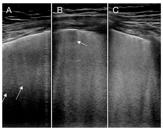 Lung ultrasound (LUS) of three different patients with COVID-19 showing multifocal (A,B) (marked with an arrow) and confluent B-lines (C). In (B), a small subpleural consolidation is also seen (marked with an arrow).