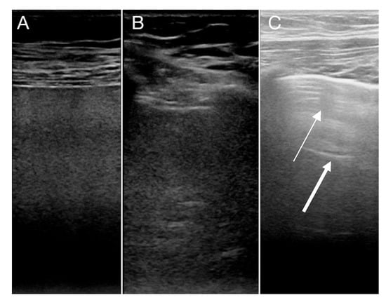 Large consolidations with hepatization in (A,B). Note the absence of A- and B-lines. In (C), LUS of a normal lung segment is shown with focal B-lines and A-lines present (thin arrow points to B-Lines and the bold arrow to A-line).
