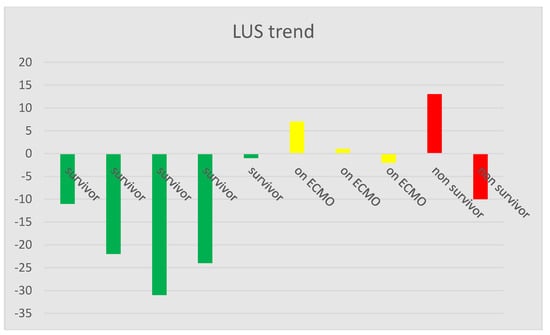 When comparing the LUS score over time, there was a trend suggesting that patients with a lower score over time were capable of being weaned from VV-ECMO, as shown in Table 3 and illustrated in Figure 6. Patients with no major changes in the LUS score were still on VV-ECMO and presented major changes in lung function when recording of data was ended. In the non-survivor group, patient 9 showed the largest increase in the LUS score and died on VV-ECMO, because of worsening of the condition with spontaneous bleeding into the pleural cavity. Patient 10 showed a decrease in LUS score and improvement in lung function, CRP and compliance but died from intraabdominal bleeding, and is therefore an outlier, as seen in Table 3 and Figure 6, with the impact on mean scores in Table 2.