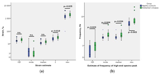 Displacement parameter estimate comparisons between healthy controls and patients with Alzheimer’s disease (AD): (a) strain and (b) frequency of high-end spectra peak (FreqHP). AD patients had a longer exponential tail of strain distribution (as evaluated by ex-Gaussian distribution τ and maximum estimates), FreqHP (as evaluated by mode, median and maximum estimates), and a higher variability of FreqHP (as evaluated by interquartile range (IQR) estimate). Boxplots represent median (midline of box), Q1 and Q3 (lower and upper side of box, respectively); whiskers are no greater than 1.5 × IQR. P values are according to the Mann–Whitney test; n.s. = non-significant differences.
