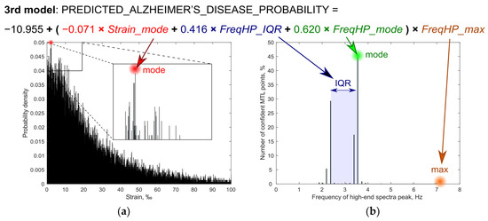 Visualization of four parameter estimates which were included into logistic regression models. Example based on the third model. Sub-images represent: (a) distribution of strain and (b) frequency of the high-end spectra peak (FreqHP) of confidently repeatable moving individual points, from medial temporal lobe (MTL). FreqHP_IQR—FreqHP interquartile range, Hz; FreqHP_max—FreqHP maximum, Hz; FreqHP_mode—FreqHP mode, Hz; Strain_mode—strain mode, ‰.