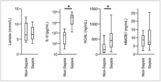 Boxplots of lactate, interleukin-6 (IL-6), neutrophil gelatinase-associated lipocalin (NGAL), and high-mobility group box 1 (HMGB1) levels at intensive care unit (ICU) admission in patients with and without sepsis. The error bars show the total range. * p < 0.01.