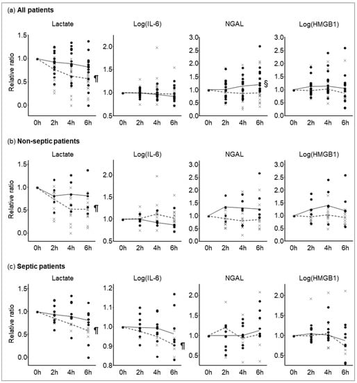 Lactate, IL-6, NGAL, and HMGB1 kinetics in (a) all patients, (b) patients without sepsis, and (c) patients with sepsis. Solid lines and black circles indicate non-survivors; dashed line and gray x-marks indicate ICU survivors. Solid and dashed lines connect the median at each time. ¶: p < 0.05 compared with 0 h in survivors. §: p < 0.05 compared with 0 h in non-survivors.