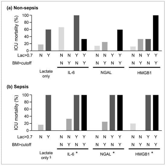 The effect of the combination with lactate and each other biomarker (BM) was analyzed for (a) non-septic and (b) septic patients. The enrolled patients were divided to four groups according to the cutoff value of 6 h/0 h ratio determined by the ROC analysis (Table 2). Y denotes elevation of the biomarker to more than the cutoff values, and N denotes otherwise. §: p < 0.05 in comparison between the N group and the Y group. *: p < 0.05 in comparison among the N/N group, N/Y or Y/N group, and Y/Y group.