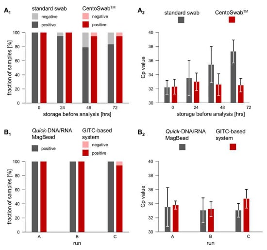 A commercially available product (IsohelixTM DNA/RNA Buccal Swab SK-1S; Cell Projects Ltd., Harrietsham, UK) was compared to the newly developed CentoSwab™ (CENTOGENE AG, Rostock, Germany). Unsampled swabs (n = 20 each as negative controls) did not give an amplification product after storage at 4 °C for up to 72 h. For swabs that had been spiked with high viral titer specimen, the fraction of reactions resulting in an amplification product decreased after prolonged storage; this issue was less pronounced for CentoSwabTM (Figure 1A1). Similarly, an ever-increasing number of RT-PCR cycles was necessary to amplify from the commercial swab, but not from CentoSwabTM (Figure 1A2). The coefficients of variation in these validation experiments ranged from 3.1% to 7.3% for the standard swab, and from 2.9% to 4.7% for CentoSwabTM.