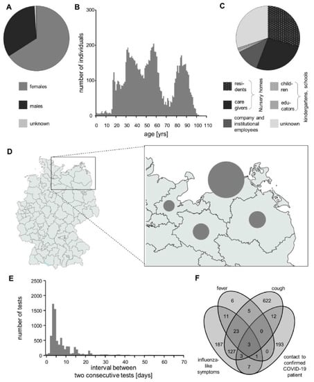 Of the 9618 tested individuals for which gender was available, 6401 were females (65.9%) and 3217 were males (33.1%) (Figure 2A). Age varied widely (Figure 2B). The largest group of individuals (n = 5428; 55.8% of all) was from nursery homes (Figure 2C). Tested individuals originated from different areas in north-eastern Germany (Figure 2D). While 7167 individuals (73.7% of all) got tested once, the remaining 2553 individuals (26.3%) got tested recurrently (from 2 to 22 times). The time interval between tests ranged widely, with three days and four days being outstandingly frequent (Figure 2E). Only a small fraction of individuals were reporting unspecific symptoms like fever (n = 49; 0.3% of all), cough (n = 796; 4.5%), or other influenza-like symptoms (n = 362; 2.1%); the same was true regarding contact with confirmed COVID-19 patients (n = 219; 1.2%). When these features were present, however, they tended to co-occur (Figure 2F).