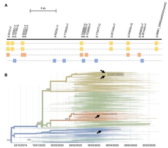 Genomes of the identified Severe Acute Respiratory Syndrome Coronavirus-2 (SARS-CoV-2) species. (A) To scale scheme of the 29,903 bp viral reference genome as a horizontal black line (NC_045512). Variants detected in at least one of the four sequenced specimens are indicated above; presence of the variant in question in a sample (samples as stippled horizontal lines) is indicated by a colored square. (B) Phylogenetic analysis of the four SARS-CoV-2 genomes (colors corresponding to those used in (A); image generated using tools as provided by Nextstrain [19]). 19A, 19B, 20A, 20B, and 20C denote the currently recognized five major clades; arrows indicate where the presently analyzed virus genomes map in the overall phylogenetic tree.