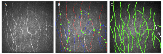 Illustrations representative of (A) raw IVCM images, (B) images marked manually with CCMetrics and (C) images marked automatically with ACCMetrics. In the image analysed by CCMetrics, nerve fibres are marked by red lines, nerve branches are marked by blue lines, and branch points are marked by green dots. In the image analysed by ACCMetrics, a low contrast nerve fibre is missed out (white arrows).