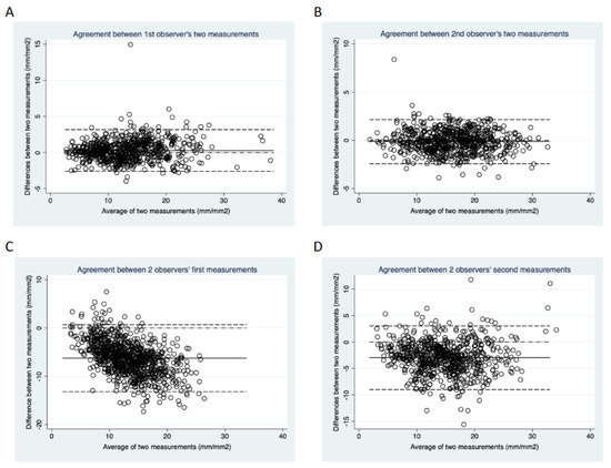 The inter-observer mean biases and LoA of the different parameters are presented in Figure 2C,D and Table 4. All three parameters, CNFL, CNFD, and CNBD, showed no statistically significant inter-observer difference. The mean bias of CNFL improved from−6.692 mm/mm2 in the first measurement to−2.513 mm/mm2 in the second measurement. Similarly, the mean bias of CNFD improved from−7.262 fibres/mm2 in the first measurement to−4.471 fibres/mm2 in the second measurement. In addition, the Bland Altman plot of the agreement between the two observers’ second measurements depicts a more symmetrical pattern about the line of mean difference compared to that of the two observers’ first measurement (Figure 2D), indicating that the second CNFL measurement demonstrated better inter-observer agreement than the first measurement. The dots in the Bland Altman plots of the agreement between observer 1′s two measurements and observer 2′s two measurements are closer to the zero line, compared to that of the two observers’ first measurements and the two observers’ second measurements, suggesting that inter-observer agreement is worse than intra-observer agreement for CNFL values.