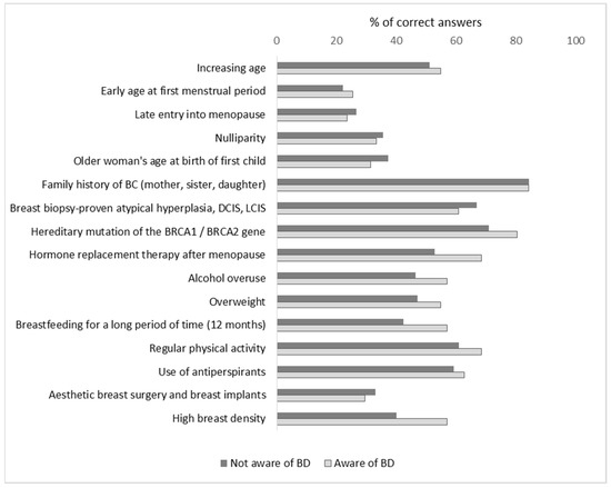 Breast cancer (BC) risk factor knowledge with regard to BD awareness. Patients aware of their BD knew significantly more frequently that taking the hormone replacement therapy after menopause (p = 0.04) and higher BD (p = 0.03) are BC risk factors.