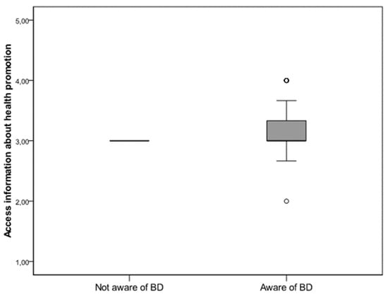 Participants who were aware of their BD could more easily access information within the health promotion domain based on HLS-EU-Q47 (p = 0.03) (Figure 2). No statistically significant differences were found between women who were aware of their BD and those who were not aware of it, with regard to the remaining domains of the questionnaire.