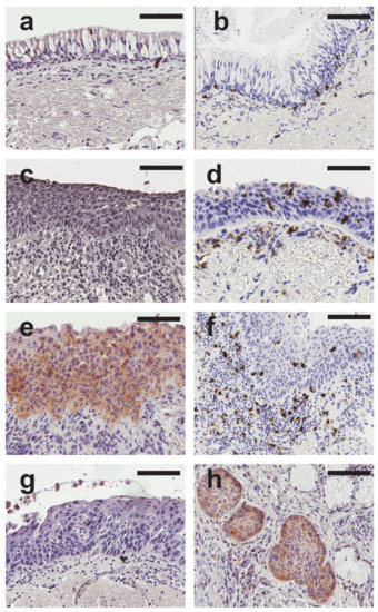 Representative images of PD-L1 and CD8 staining in normal, metaplastic and dysplastic epithelium. All images were taken at ×200 of magnification. Scale bar = 100 µm. (a) Immunohistochemistry anti-PD-L1 in normal bronchial epithelium showing that epithelial cells are not stained. (b) Immunohistochemistry anti-CD8 in normal bronchial epithelium showing a staining of scattered lymphocytes in the submucosa. (c) Immunohistochemistry anti-PD-L1 in bronchial metaplasia showing that epithelial cells are not stained. (d) Immunohistochemistry anti-CD8 in bronchial metaplasia showing staining of intraepithelial lymphocytes and lymphocytes in the submucosa. (e) Immunohistochemistry anti-PD-L1 in bronchial dysplasia showing a staining of dysplastic cells in this case of moderate dysplasia. (f) Immunohistochemistry anti-CD8 in bronchial dysplasia showing staining of intraepithelial lymphocytes and lymphocytes in the submucosa. (g) Immunohistochemistry anti-PD-L1 in bronchial dysplasia showing that none of the dysplastic cells are stained. (h) bronchial glands colonization by PD-L1 positive dysplastic cells without stromal invasion in a case of high grade dysplasia.