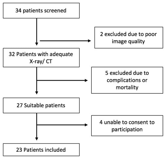 Local institutional ethical approval was obtained. A retrospective observational cohort study was undertaken in our center. This included consecutive critical care patients diagnosed and treated in University Hospital Limerick, Ireland over a 12-month period between January 2018 and January 2019. We conducted a retrospective study of patient records and radiology images. Adult patients who had an appropriately sized tracheostomy at Limerick University Hospital were included in the study. Tracheostomies were performed using either a percutaneous or open surgical approach between the first and third tracheal cartilage rings. Patients were required to have a suitable quality chest X-ray or CT scan, in order to obtain airway measurements. All patients included were admitted to the critical care unit. All X-rays were taken using the Siemens Mobilette Mira Max machine, and window settings were adjusted to maximize contrast between soft tissue and trachea. Exclusion criteria included unsuitable imaging, patient mortality within 30 days of tracheostomy placement or complicated peri-operative course. Patients with poor quality radiological imaging unsuitable for scaled measurement were excluded from the study (Figure 1).
