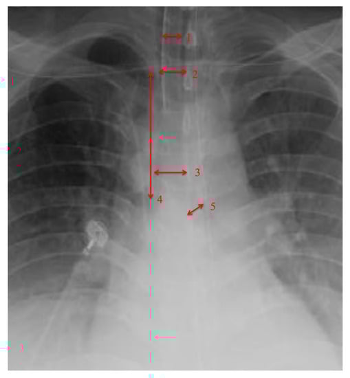 Measurement of trachea anatomy. 1 = endotracheal tube measurement for scale, 2 = trachea diameter at 1st rib, 3 = trachea diameter at carina, 4 = trachea length 1st rib to carina, 5 = left main bronchus diameter.
