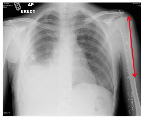 Radiograph demonstrating radio-opaque marker parallel to left humerus.