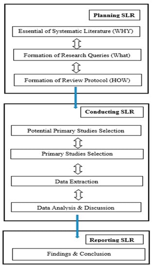 We performed an SLR utilizing the rules given in [17]. The SLR is an examination strategy for performing a survey efficiently capturing all characterized advances [17]. There are generally three stages of an SLR: planning the SLR, directing the SLR, and reporting the SLR (see Figure 2). Below, we discuss how we performed each part in these three stages.