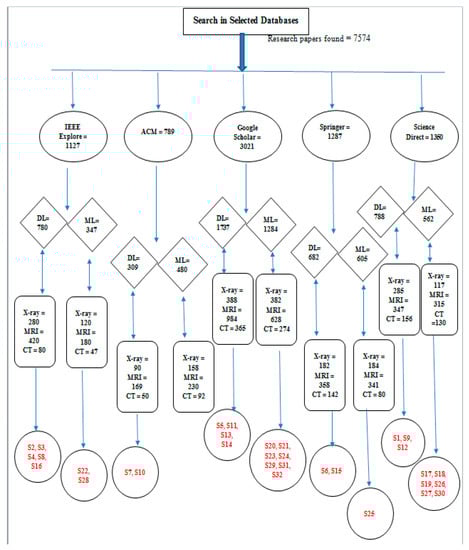 We determined our results by calculating the average of each image type, i.e., to determine the accuracy of X-ray images for deep learning, we summed up the accuracy of each X-ray paper and divided the sum by the total number of X-ray papers. In our study, there are six X-ray papers for deep learning, so we calculated it by dividing the accuracy sum by six. Similarly, we calculated the total accuracy for the MRI and CT scan image types.