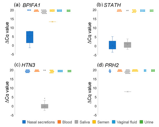 Figure 1. Box plots showing expression levels of BPIFA1 (a), STATH (b), HTN3 (c), and PRH2 (d) in various body fluids. Each dot at around ΔCq = 20 represents samples that show no amplification or are outside of the linear range.