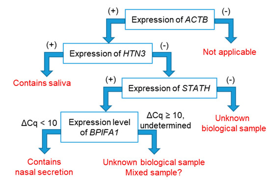 To improve the specificity of the discrimination among nasal secretion, saliva and other biological samples, a flowchart was proposed (Figure 2). First, an ACTB-positive sample was entered into the flowchart, and if HTN3 was positive, the sample was considered to be a “saliva-containing” sample. If HTN3 was negative, the expression of STATH was evaluated. If STATH was also negative, the sample was considered an “unknown” biological sample. For STATH-positive samples, the expression level of BPIFA1 was evaluated. If the ΔCq value of BPIFA1 was <10, the sample was considered to be a “nasal secretion-containing” sample. If the ΔCq value of BPIFA1 was ≥10 or undetermined, the sample was also considered an “unknown” biological sample. As shown in Table 4, nasal secretion and saliva were specifically discriminated among various body fluids analyzed in this study using the proposed flowchart. All the other ACTB-positive body fluids were determined to be unknown biological samples; however, 3 of 10 nasal secretions and 2 of 16 saliva samples were also classified as unknown biological samples.