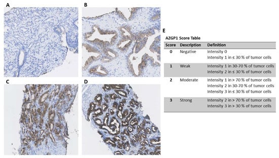 Immunohistochemical staining of the diagnostic specimen was performed using a 1:500 dilution of anti-AZGP1 in accordance with a former protocol (HPA012582; Sigma Aldrich, St. Louis, MO, USA) []. The stained slides were digitalized using the Hamamatsu Nano ZoomerXR, and evaluation conducted using the Hamamatsu NDP.view V.2.6.12 viewing software. The presence of intracellular AZGP1 immunoreactivity in biopsies was evaluated by one observer (M.D.W.). Each biopsy core was given a score from 0 to 3 based on the fraction of positive tumor cells and the intensity of cytoplasmic staining (Figure 1) [] using a previously described and standardized approach [,]. The immunohistochemical assessment was performed blinded to all clinical endpoints.