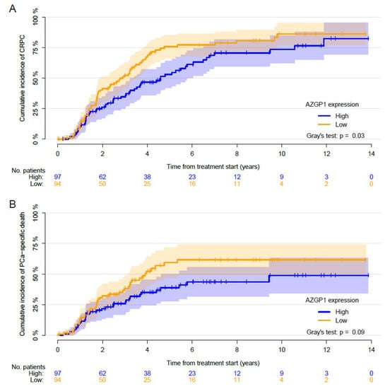 Cumulative incidence of (A) progression to castration-resistant prostate cancer (CRPC) and (B) prostate cancer (PCa)-specific death after the start of androgen deprivation therapy (ADT) treatment. Competing events are (A) death before the progression event and (B) death from other causes than PCa. Patients were stratified based on the AZGP1 expression. p values for Gray’s test are reported.