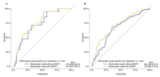A total of 150 (79%) patients died during the follow-up, 77 (40%) from PCa and 73 (38%) from other causes. The median time from the start of ADT to PCa-specific mortality was 3.9 years (95% CI: 3.2—not reached (NR)) and NR years (95% CI: 4.6-NR) for the AZGP1 low and high expression groups, respectively. The 5-year cumulative incidence of PCa-specific mortality was 48% (95% CI: 40–57), and the cumulative incidence of other cause mortality was 41% (95% CI: 32–50). No differences in the risk of PCa-specific mortality was found when comparing the cumulative incidence for AZGP1 expression, although a trend was found (Gray’s test: p = 0.09; Figure 2). After adjustment for other covariates, only PSA remained significantly associated with the risk of PCa-specific mortality (HR: 1.2; 95% CI: 1.1–1.4; p < 0.001) (Table 3). Adding the AZGP1 expression to the predictive model did not increase the predictive ability of the model for predicting the PCa-specific mortality at 1 and 5 years (Figure 4). Moreover, AZGP1 loss was not associated with CRPC or PCa-specific mortality when the lowest AZGP1 intensity was used for each patient.