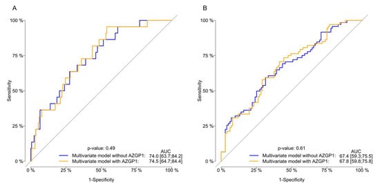 In a multivariable cause-specific Cox regression analysis (Table 2), only higher PSA was associated with a significantly higher risk of CRPC (HR: 1.2; 95% CI: 1.1–1.4; p < 0.0001). The discriminative ability for the prediction of CRPC was not affected by including the AZGP1 expression in the multivariable model. The AUC for including and omitting AZGP1 was 75.4 vs. 72.9 (p = 0.6) at 1 year and 70.0 vs. 66.3 after 5 years (p = 0.3) (Figure 3).