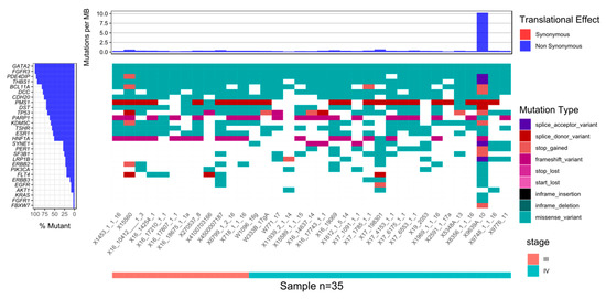 Waterfall plot of variants in most mutated genes as well as genes in which the presence of variants differentiated between stages III and IV samples, and genes relevant to BC (breast cancer). Only variants chosen according to the criteria described in the materials and methods section are shown and only samples from biopsy samples are included.