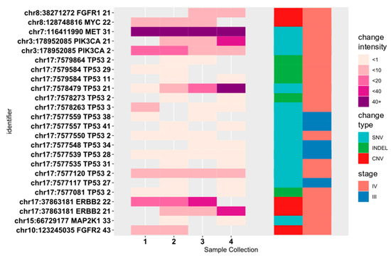To check whether the results were consistent across different sample collection times, we also selected mutations observed in at least two samples collected at two different time points from the same patients (Figure 2); variants also present in controls were excluded. Twenty genetic variants and five CNVs were present in more than one sample collected from 15 patients (Online resource: Supplementary Table S4); of these, 14 were in TP53 while the CNVs were primarily in the ERBB2 and FGFR1/2 genes. Five variants were found in stage III patient samples; however, none had VAFs > 1%.