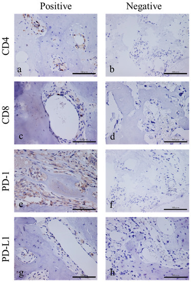 The overall positive rates were 12/16 (75%) for CD4, 12/16 (75%) for CD8, 3/16 (18.7%) for PD-1, and 10/16 (62.5%) for PD-L1. The CD4-positive and PD-L1-positive rate was 9/16 (56.2%). The CD8-positive and PD-L1-positive rate was 8/16 (50%). The PD-1 and PD-L1 concordance rate was 3/16 (18.7%). Representative positive or negative histological findings are shown in Figure 1a–h.
