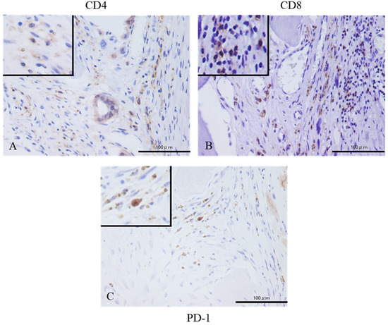 We also confirmed the localization of CD4, CD8, and PD-1 stained cells using adjacent section specimens (Figure 2A–C). Tumor-infiltrated lymphocytes (TILs) were found to be positive for CD4, CD8, and PD-1 (Figure 2A–C).
